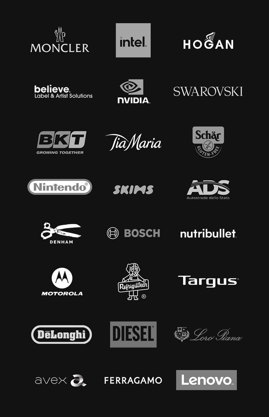 MONCLER | HOGAN | DIESEL | SWAROVSKI | INTEL | INVIDIA | NUTRIBULLET | BKT TIRES | FERRAGAMO | AUTOSTRADE DELO STATO | DISARONNO GOURP | TIA MARIA | DENHAM | BOSCH | NUTRIBULLET | MOTOROLA | TARGUS | LOROPIANA | REFRIGIWEAR | LENOVO | De'Longhi | DAVE RODGERS MUSIC | AVEX MUSIC | BELIEVE MUSIC, and many more