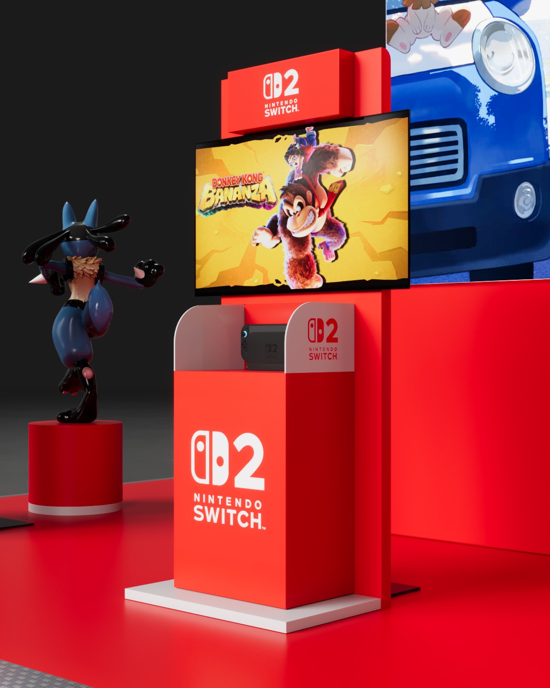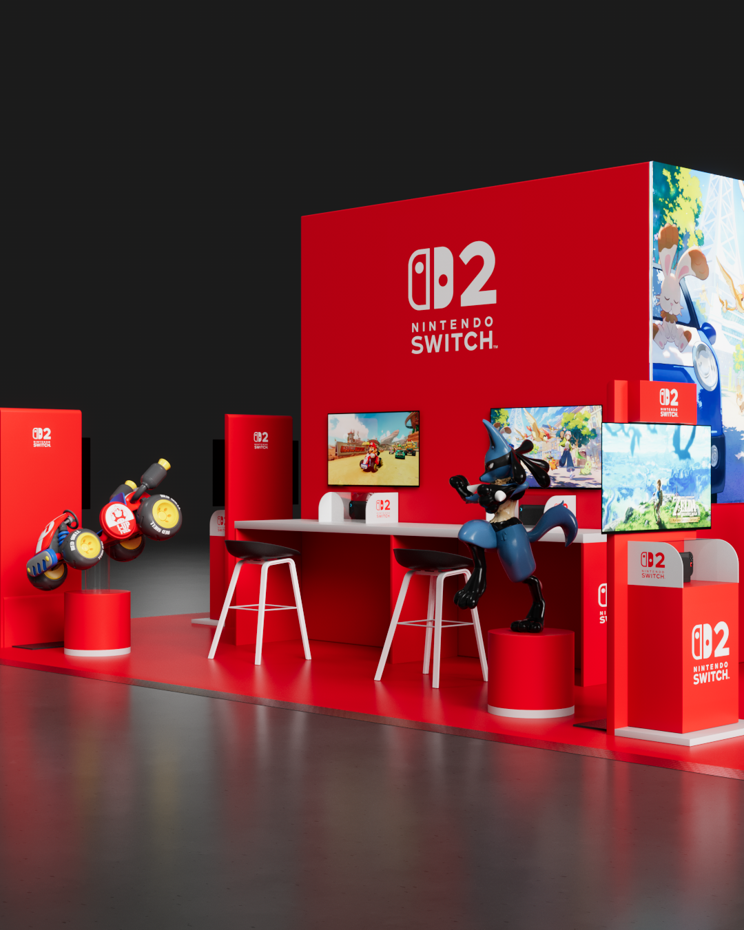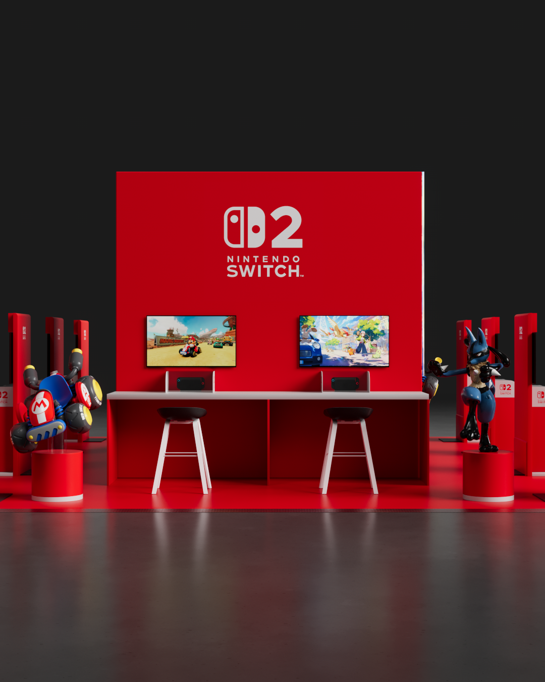 The exhibition concept for Nintendo Switch 2 is designed as a high-impact immersive island, created to attract, engage, and retain visitors from the very first glance. The iconic central cube structure acts as the beating heart of the booth: a strong visual landmark that integrates large screens, visual artwork, and branding, making it instantly recognizable within the exhibition space. The setup is built on a continuous red platform, fully aligned with Nintendo’s visual identity, and organizes the space in a clear and fluid way. Gameplay stations are distributed along the perimeter, each equipped with a dedicated screen and a minimal station design, ensuring an intuitive, accessible, and well-organized experience even during peak attendance. Iconic elements from the Nintendo universe, such as character statues and themed installations, enrich the environment and strengthen the emotional connection with the audience, while also creating ideal photo and social-sharing opportunities. The central demo area, equipped with seating, encourages longer and more relaxed play sessions, while the surrounding stations support a steady and efficient visitor flow. The result is a booth that seamlessly combines scenographic impact, functionality, and entertainment, positioning Nintendo Switch 2 as the undisputed protagonist of Games Week and delivering an engaging, contemporary experience fully aligned with the brand’s DNA. Agency: KREA DISPLAY