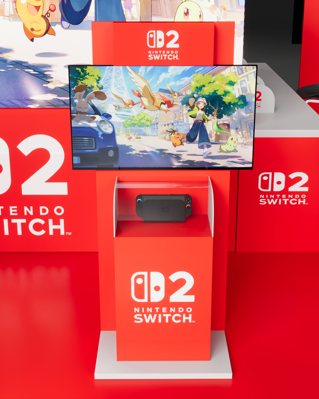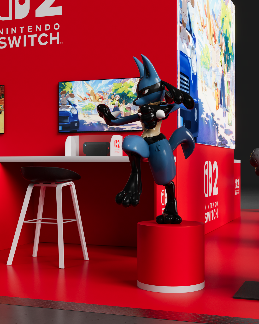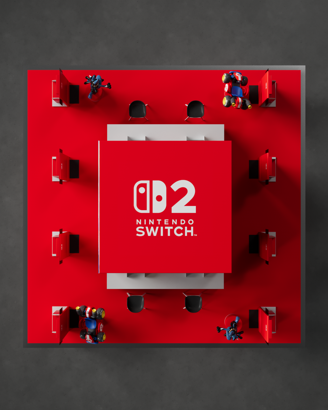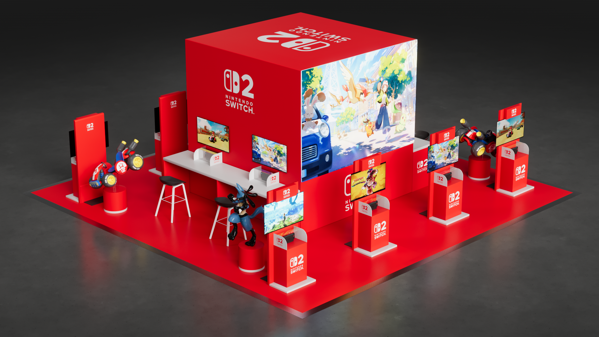 The exhibition concept for Nintendo Switch 2 is designed as a high-impact immersive island, created to attract, engage, and retain visitors from the very first glance. The iconic central cube structure acts as the beating heart of the booth: a strong visual landmark that integrates large screens, visual artwork, and branding, making it instantly recognizable within the exhibition space. The setup is built on a continuous red platform, fully aligned with Nintendo’s visual identity, and organizes the space in a clear and fluid way. Gameplay stations are distributed along the perimeter, each equipped with a dedicated screen and a minimal station design, ensuring an intuitive, accessible, and well-organized experience even during peak attendance. Iconic elements from the Nintendo universe, such as character statues and themed installations, enrich the environment and strengthen the emotional connection with the audience, while also creating ideal photo and social-sharing opportunities. The central demo area, equipped with seating, encourages longer and more relaxed play sessions, while the surrounding stations support a steady and efficient visitor flow. The result is a booth that seamlessly combines scenographic impact, functionality, and entertainment, positioning Nintendo Switch 2 as the undisputed protagonist of Games Week and delivering an engaging, contemporary experience fully aligned with the brand’s DNA. Agency: KREA DISPLAY